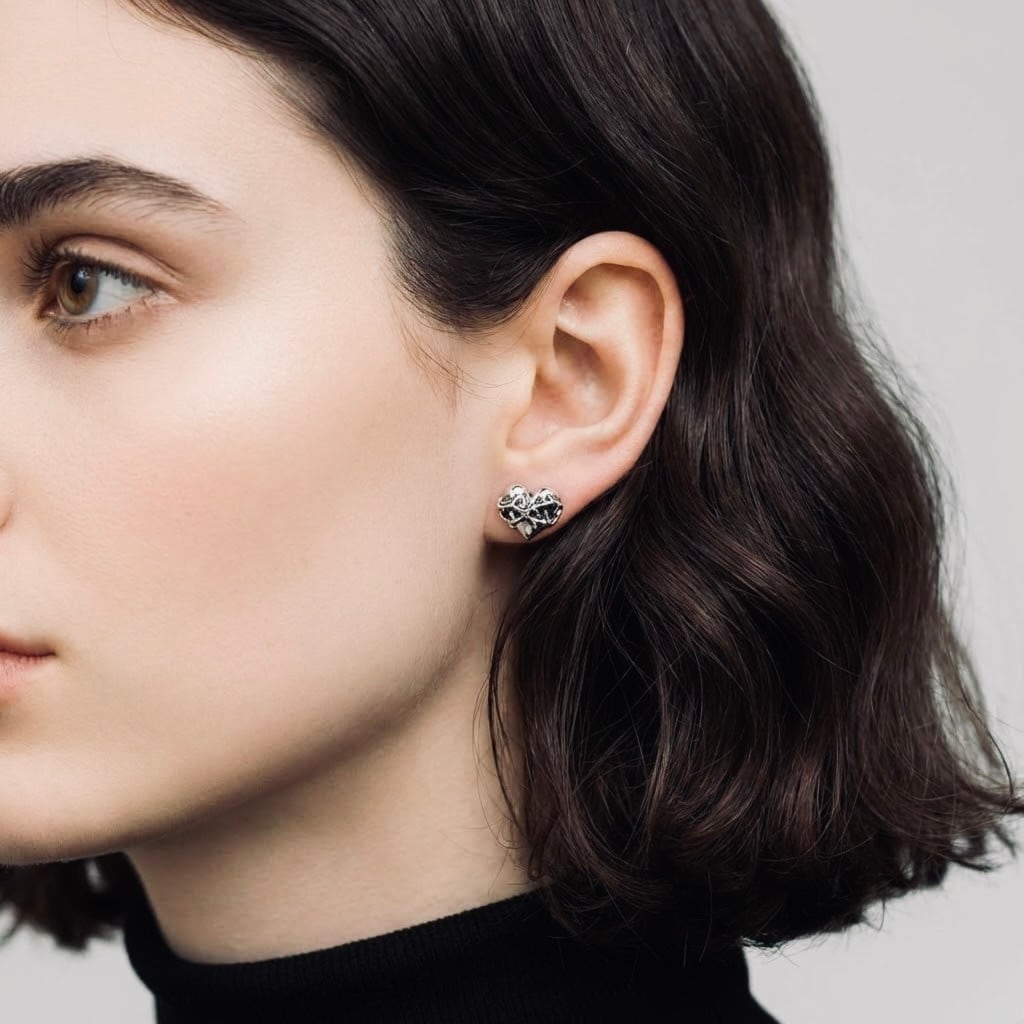 愛の象徴であるハートをあえて棘で覆うことで、愛の美しさと痛みを同時に表現したピアスです。