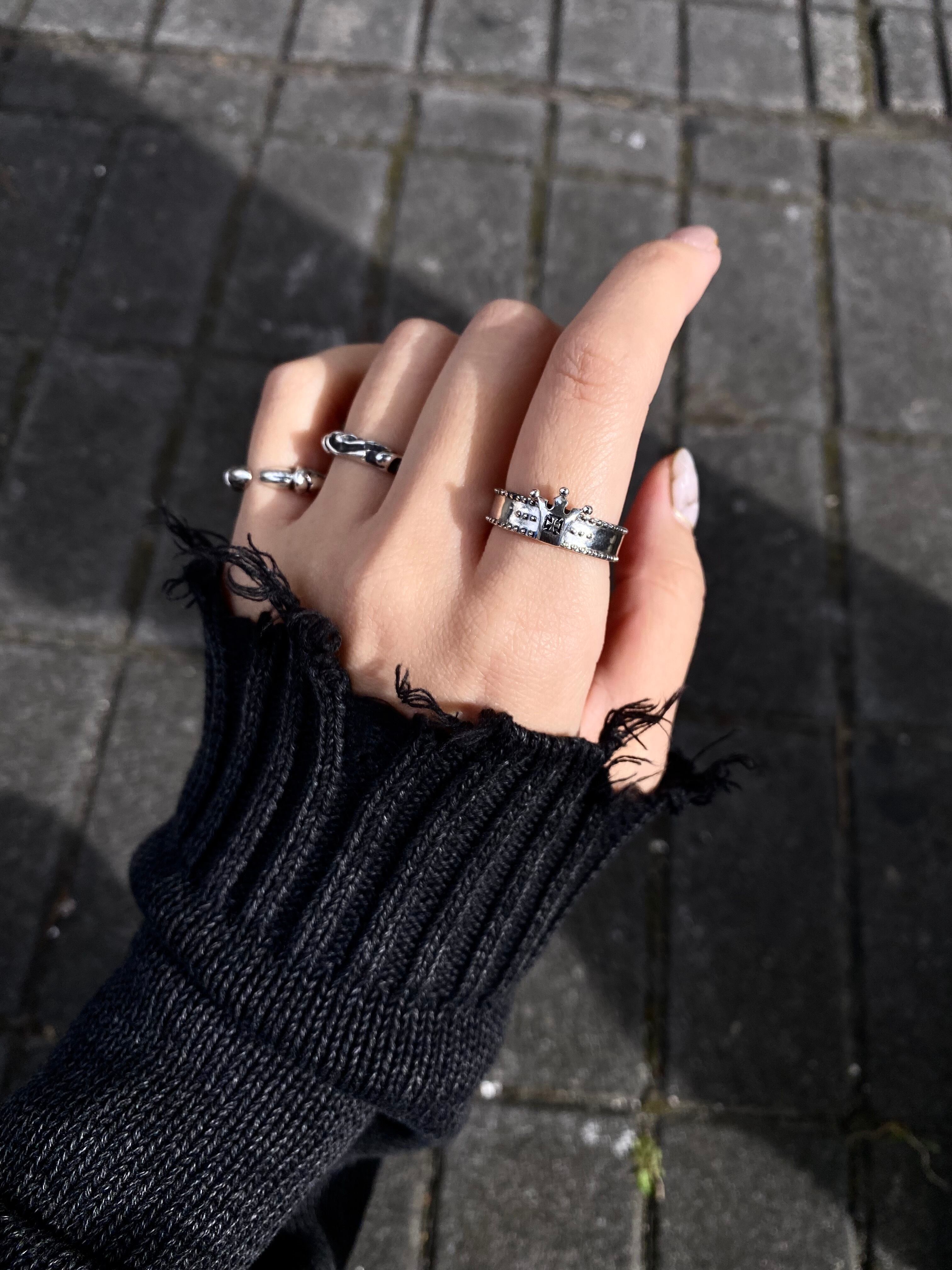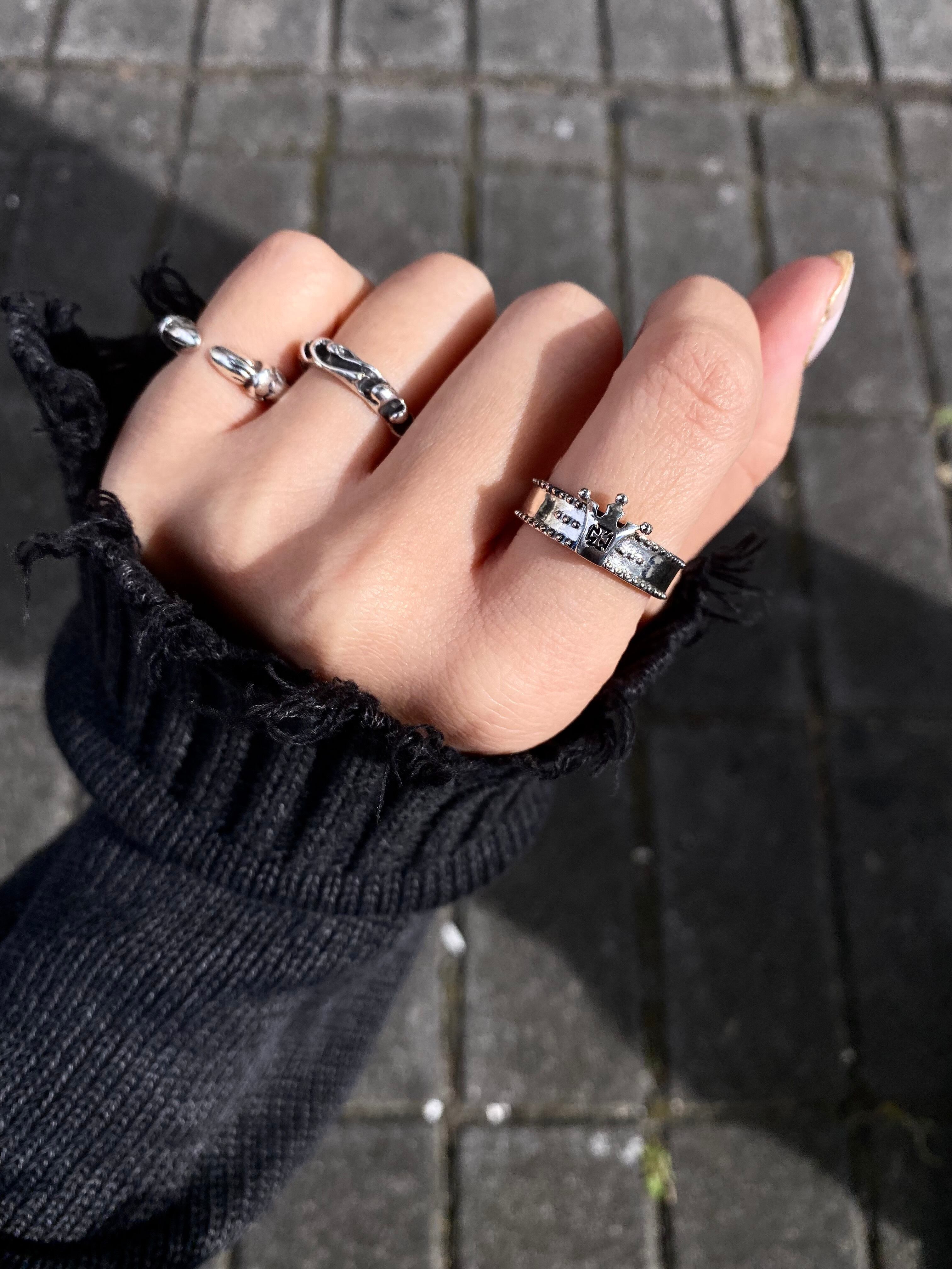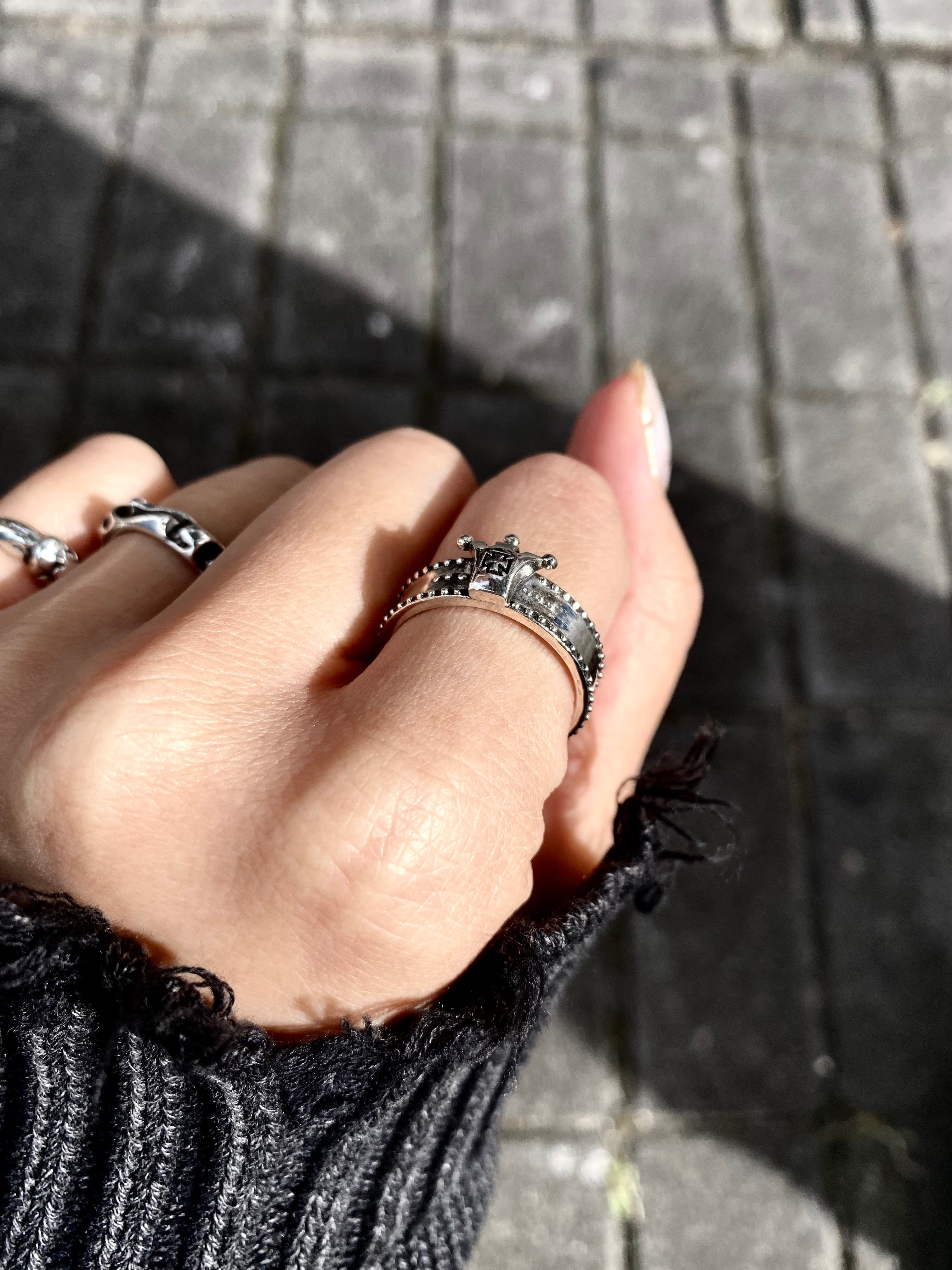 ドットで装飾され、フロントには王冠がセットされたロックテイストなリングです。