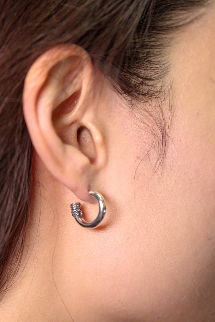 前から見るとシンプルなフープピアスですが、うしろ姿も映えるよう