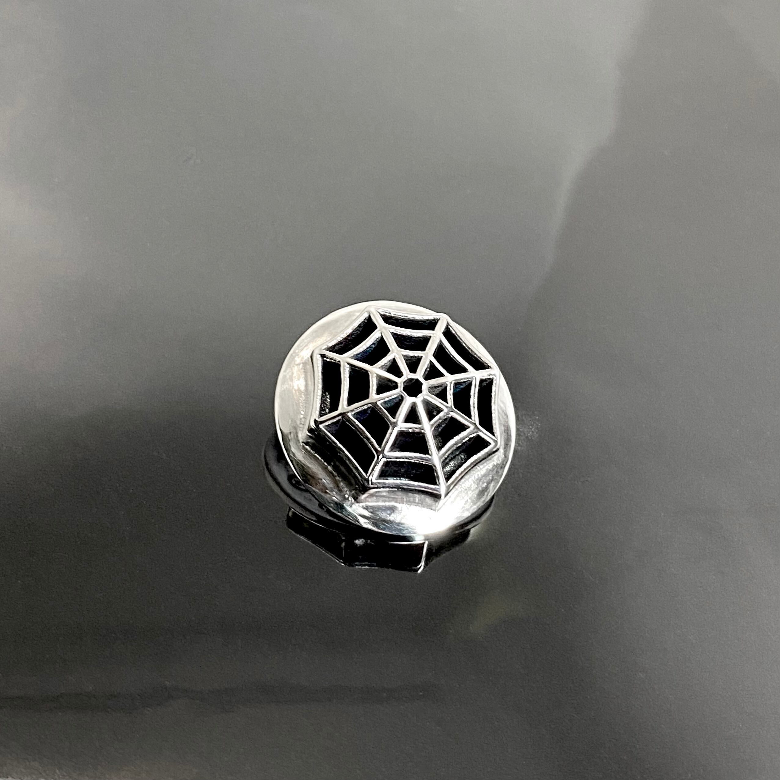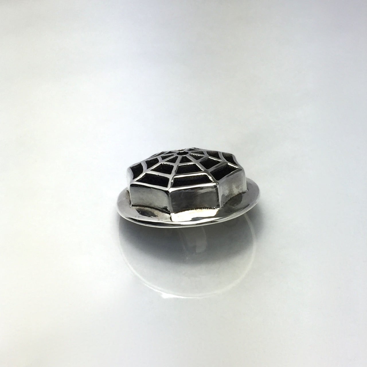 厚みのある壁で作られたスパイダーウェブがデザインされた、裏にゴムを通すタイプの髪止めです。髪をしばらない時は、ゴムブレスレットになります。