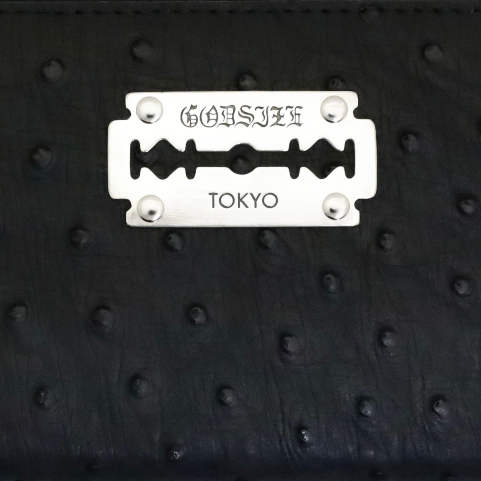 最大の特長は、ダチョウ革特有の「クィルマーク(突起)」の並びが美しい表面に配されたGODSIZEのアイコンプレート。