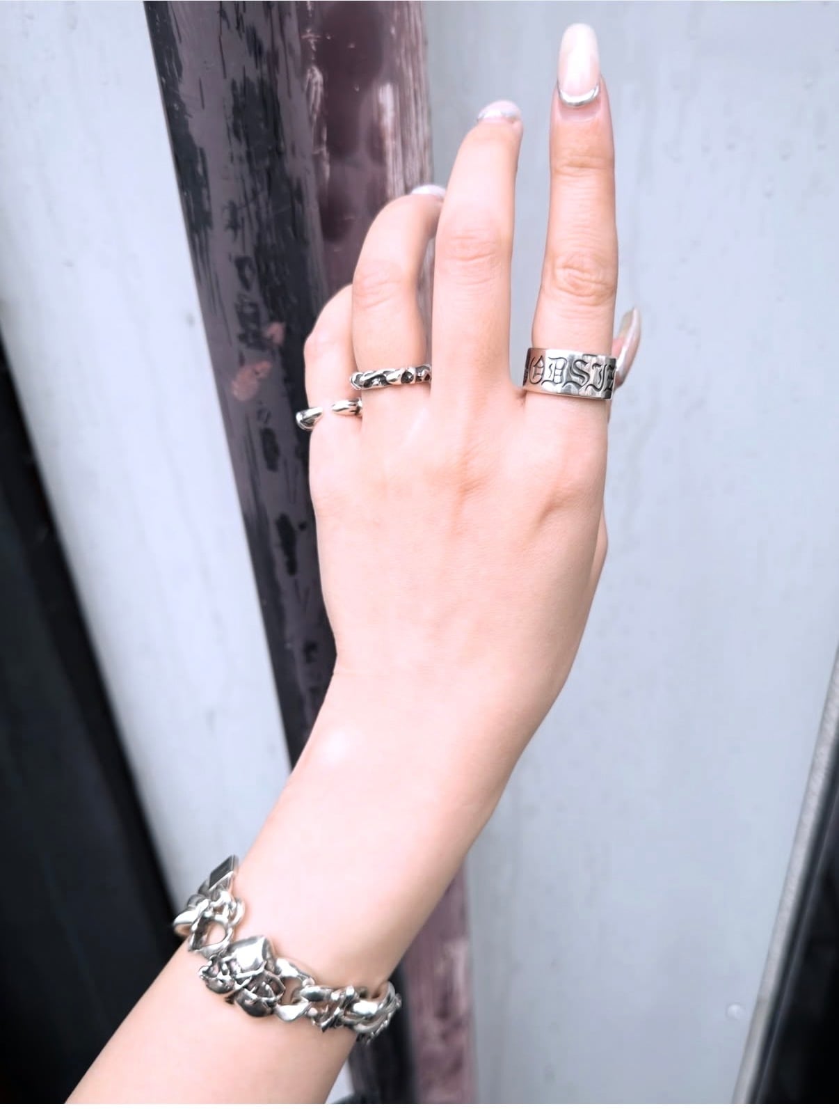 幅広のシルエットは造形の純度を最大限に引き立て、余計な装飾を排したミニマルな佇まいが、素材の輝きをより強く際立たせます。手元に宿るその存在感は、アートとジュエリーの境界を曖昧にしながら、静かに強烈な印象を刻み込むでしょう。