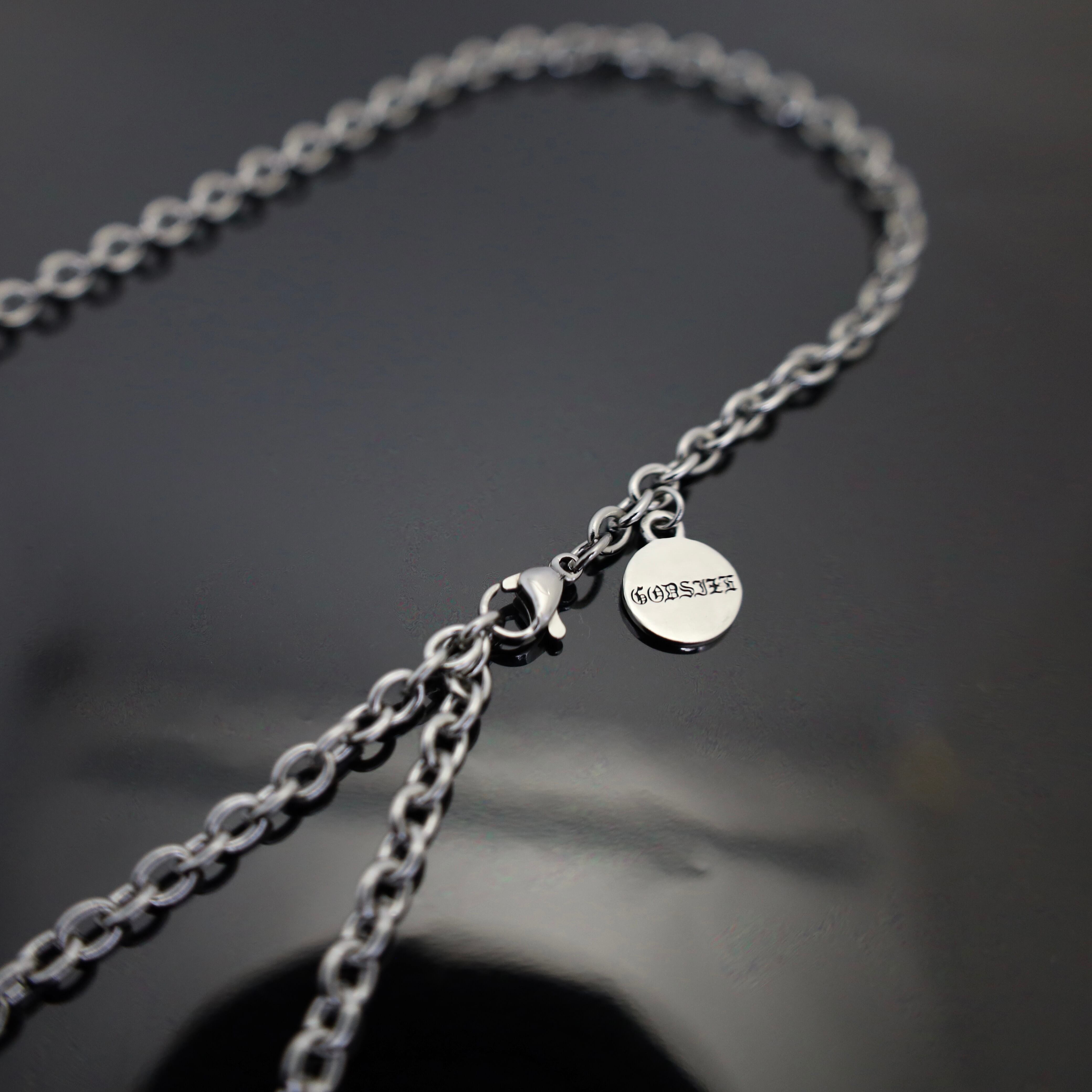 ブランドのアイデンティティを象徴する「GODSIZE」の刻印を施したラウンドタグ、そしてエンドパーツに配されたミニマルなパドロック。その一つひとつが、単なる装飾を超えた存在感を放ちます。