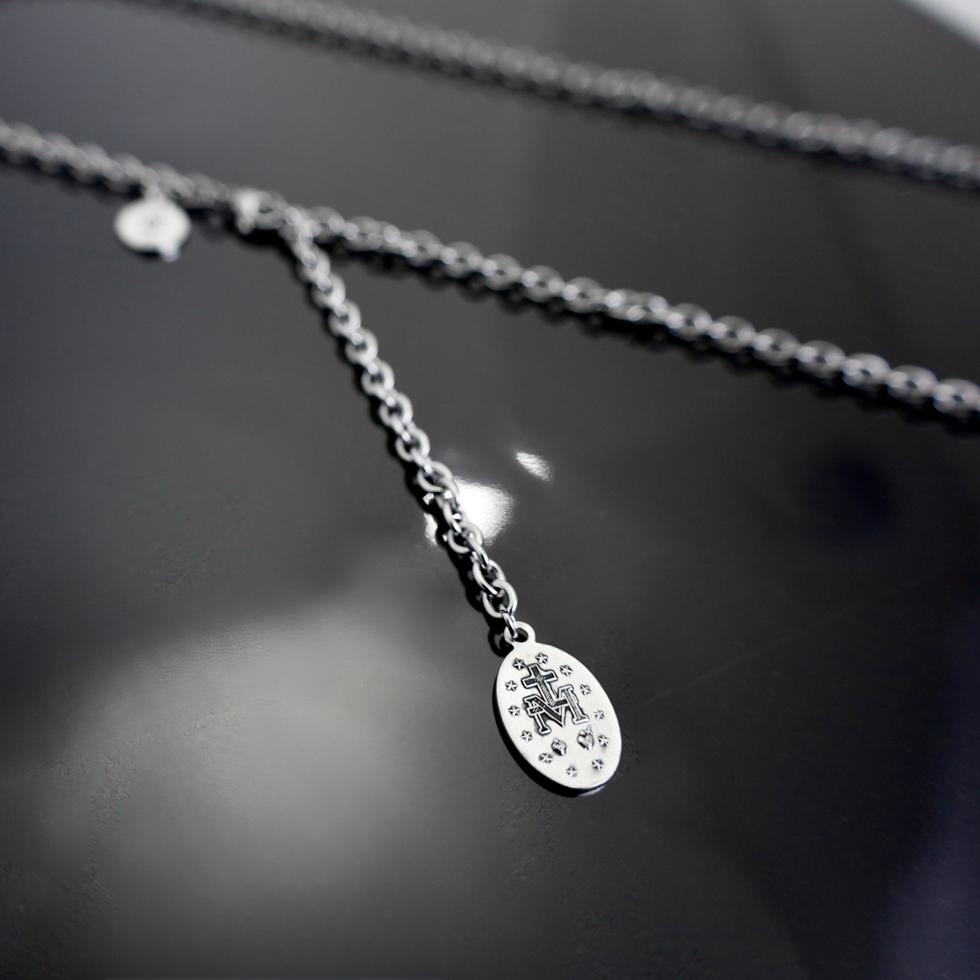 ブランドのアイデンティティを象徴する「GODSIZE」の刻印を施したラウンドタグ、そしてエンドパーツに配された「不思議のメダイ(Médaille miraculeuse)」。