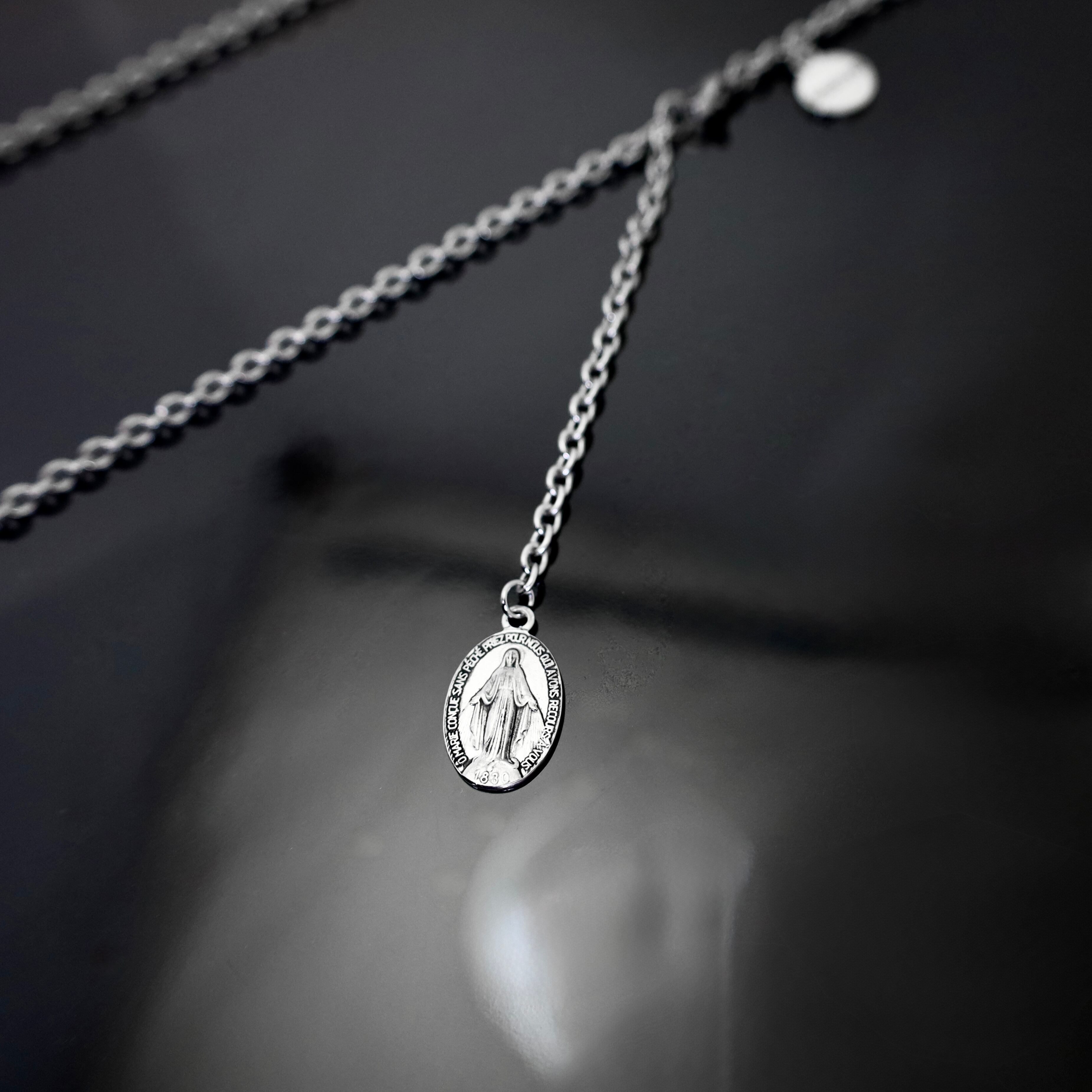 ブランドのアイデンティティを象徴する「GODSIZE」の刻印を施したラウンドタグ、そしてエンドパーツに配された「不思議のメダイ(Médaille miraculeuse)」。