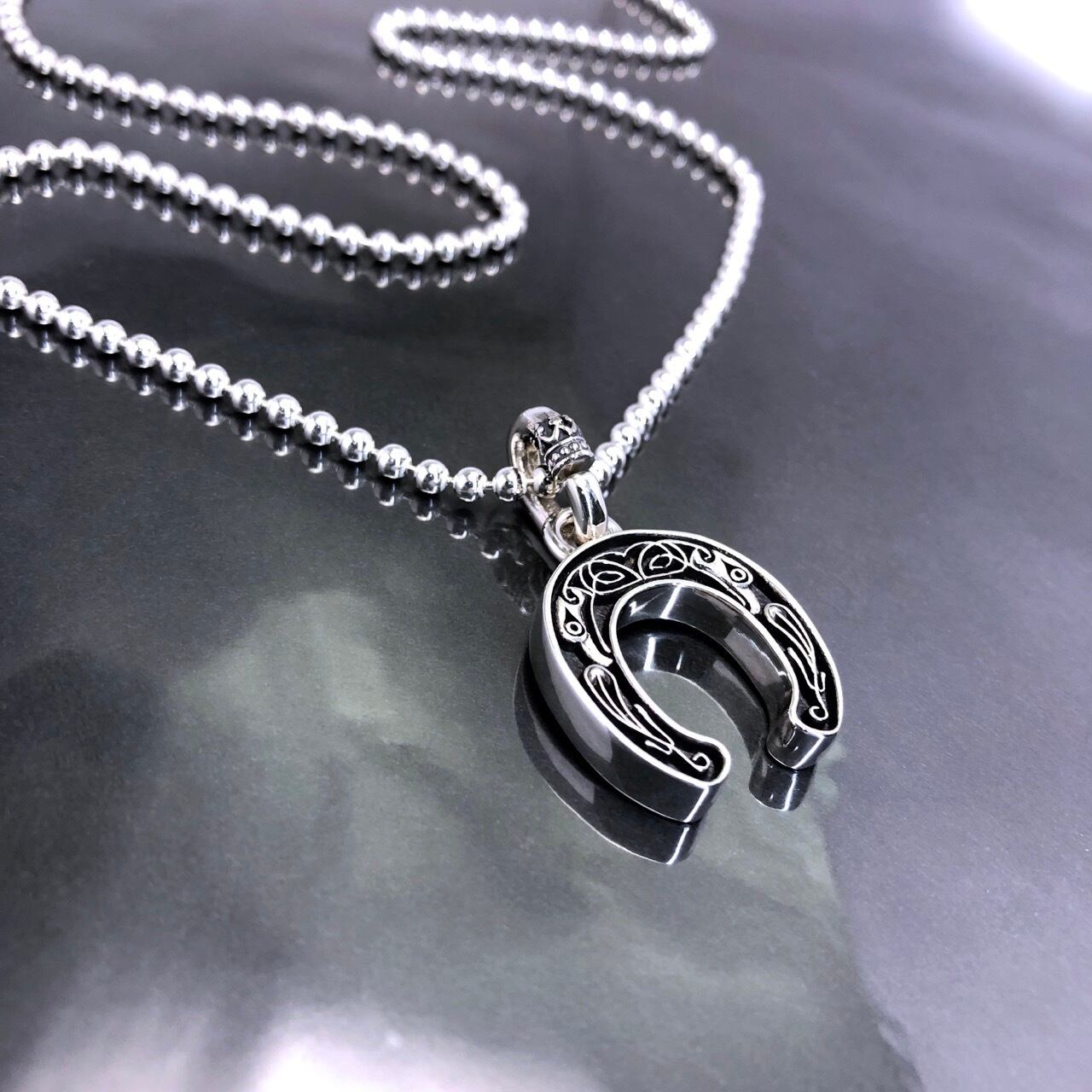 編み込んだような独特のケルトの模様が馬蹄形にデザインされたペンダントです。