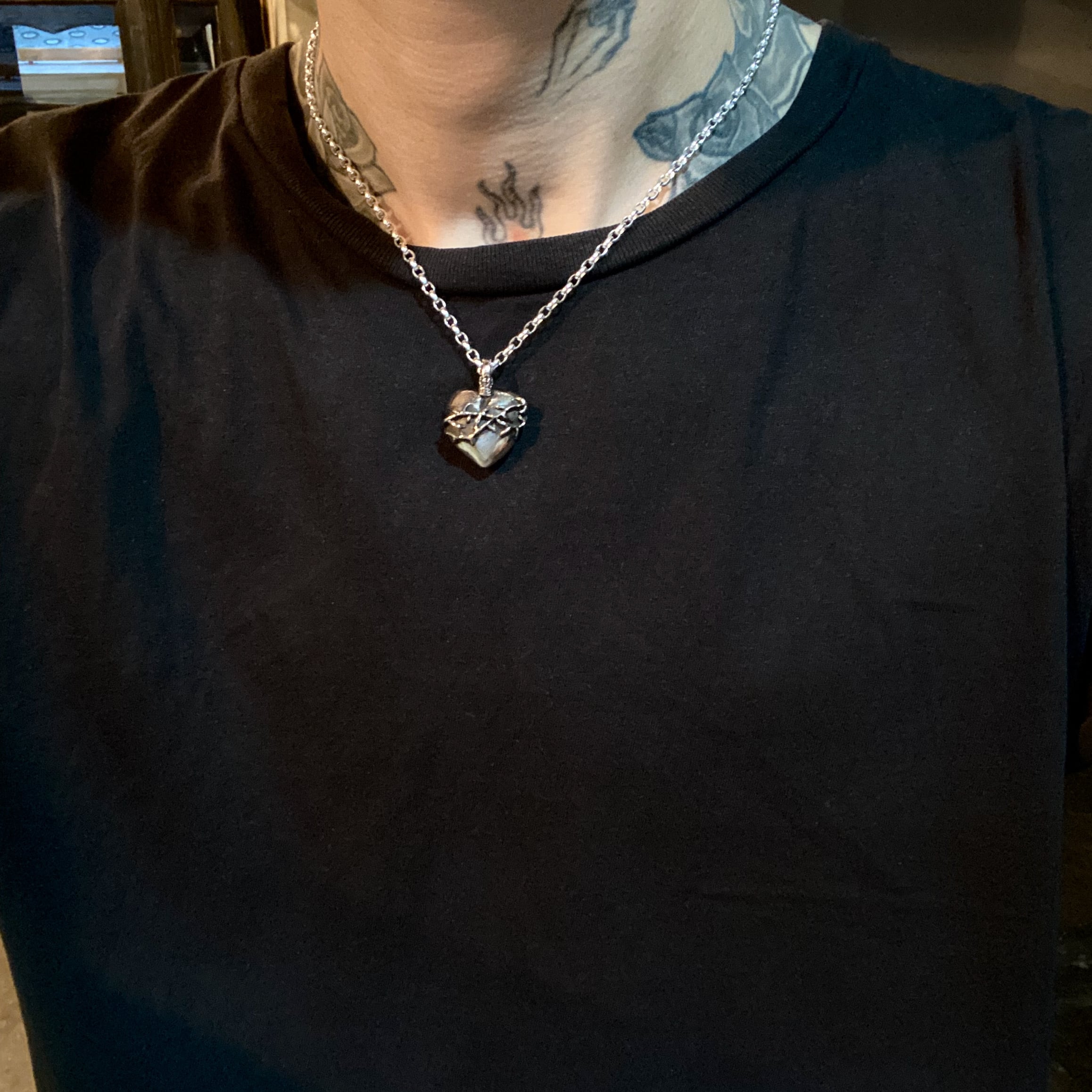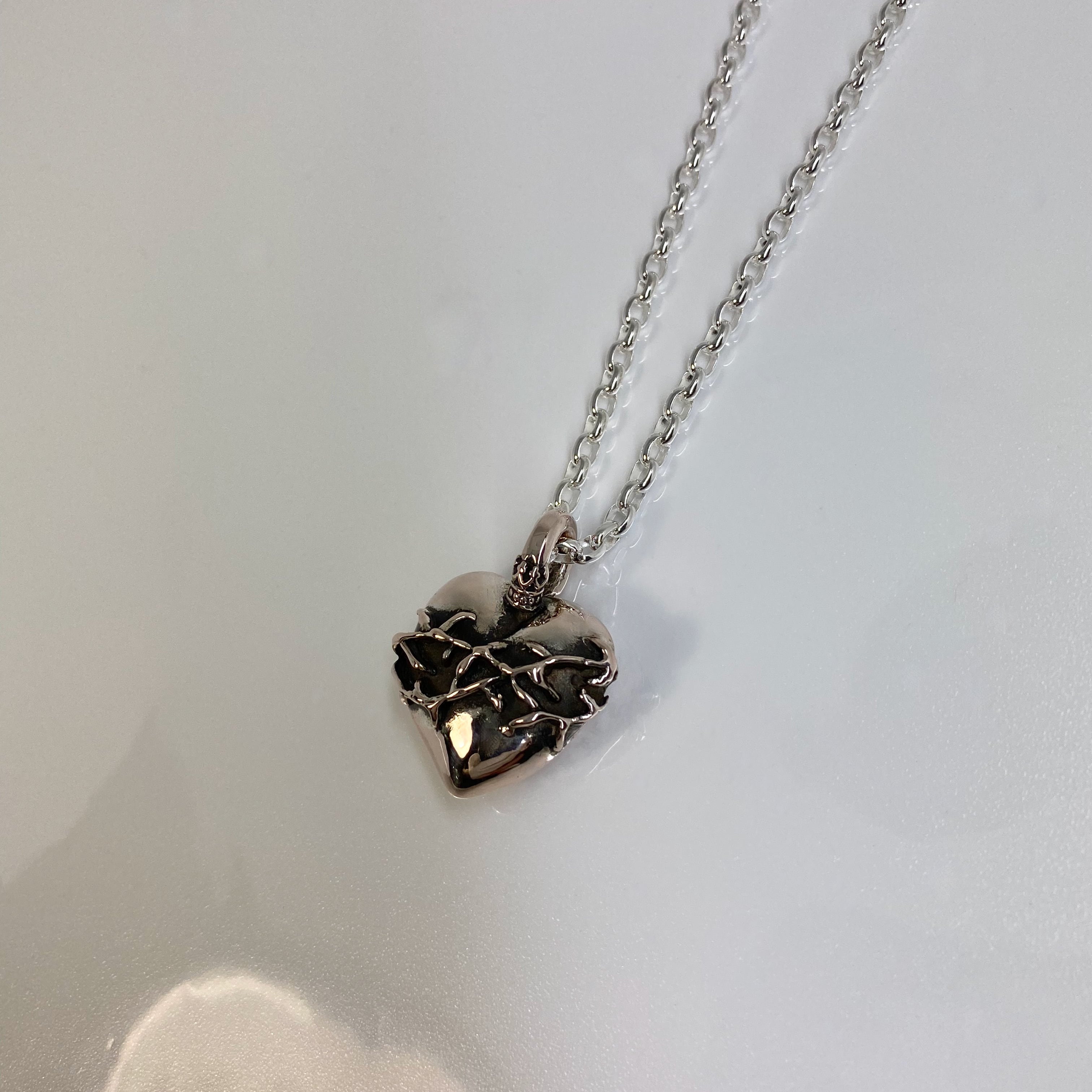 ハートにイバラが巻かれたピンクシルバーのネックレスです。フープ状のバチカン部分にはクラウンがデザインされています。