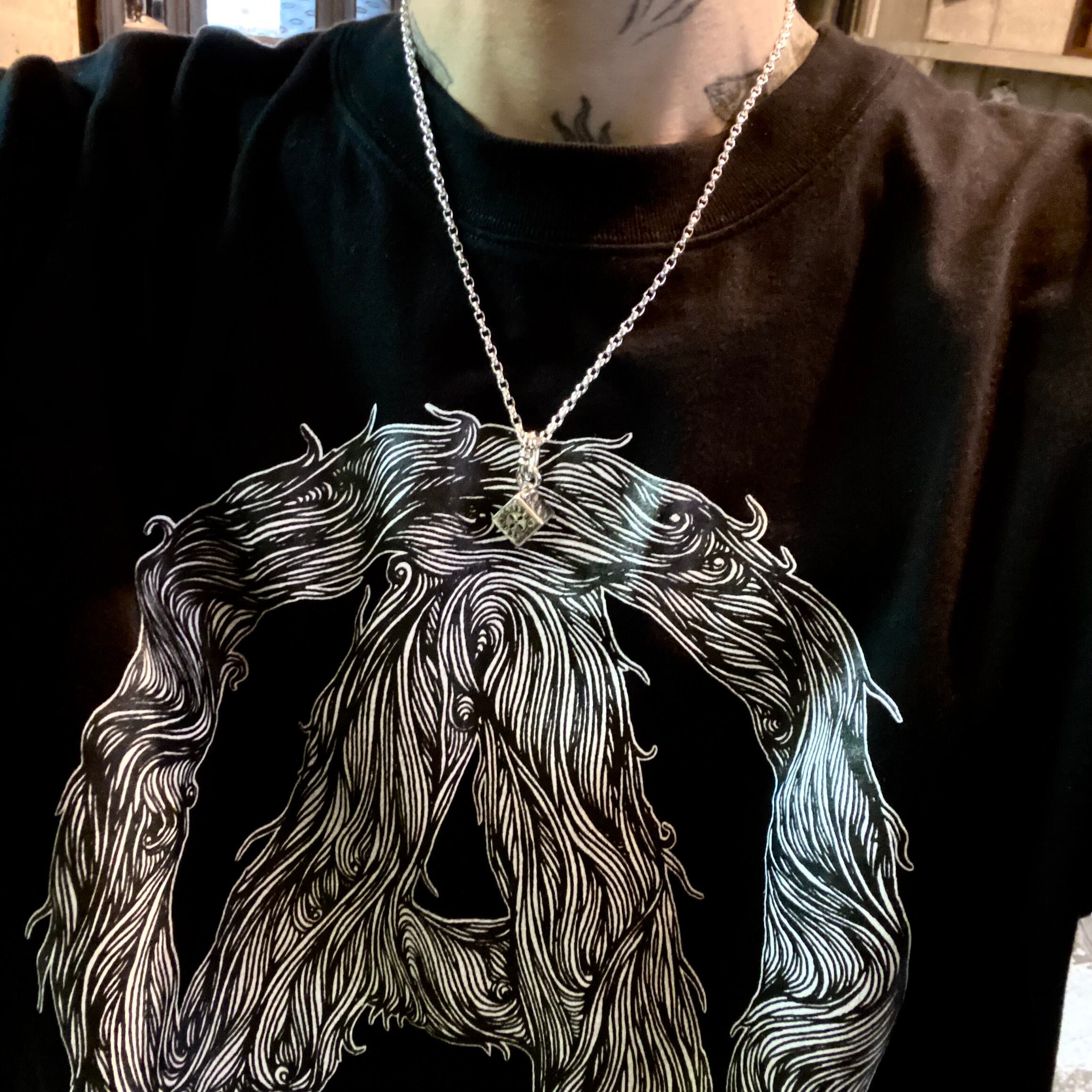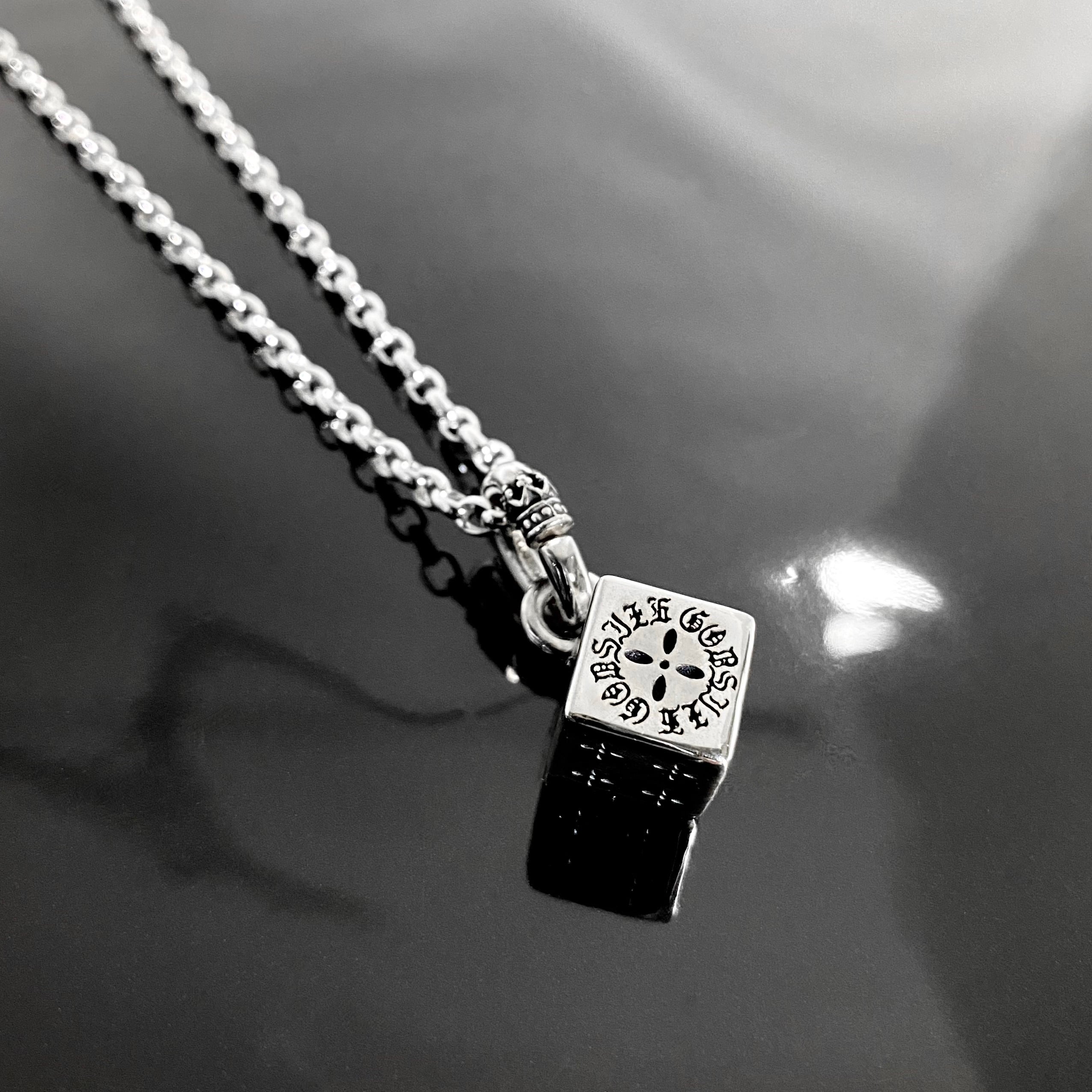 ダイスにクロスが彫刻されたロックテイストなネックレスです。