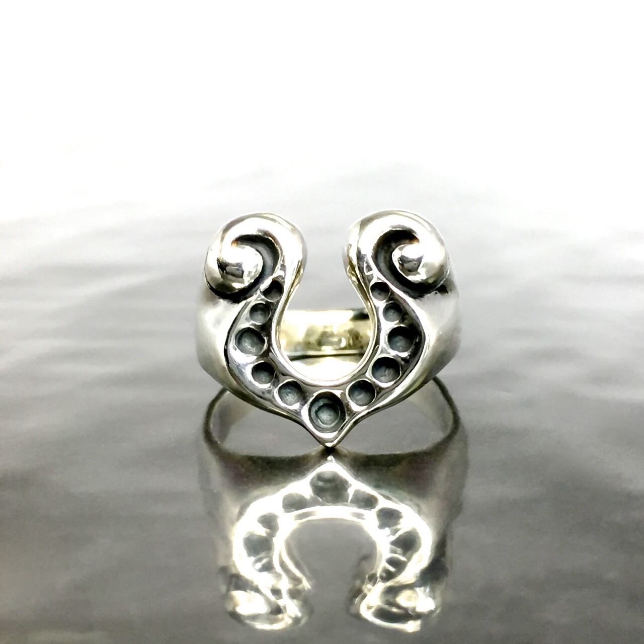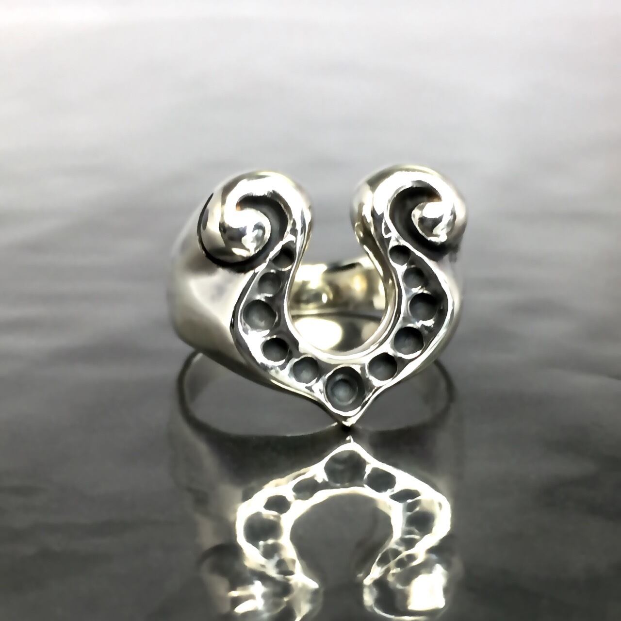 音楽の象徴である音符と幸運の象徴であるホースシューをミックス。丸みのあるフォルムが印象的なスターリングシルバーのリングです。